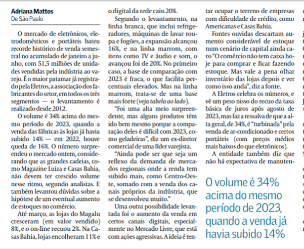 As vendas da indústria de eletrônicos, eletrodomésticos e portáteis ao varejo cresceram 34% no primeiro semestre, ante igual período de 2023.