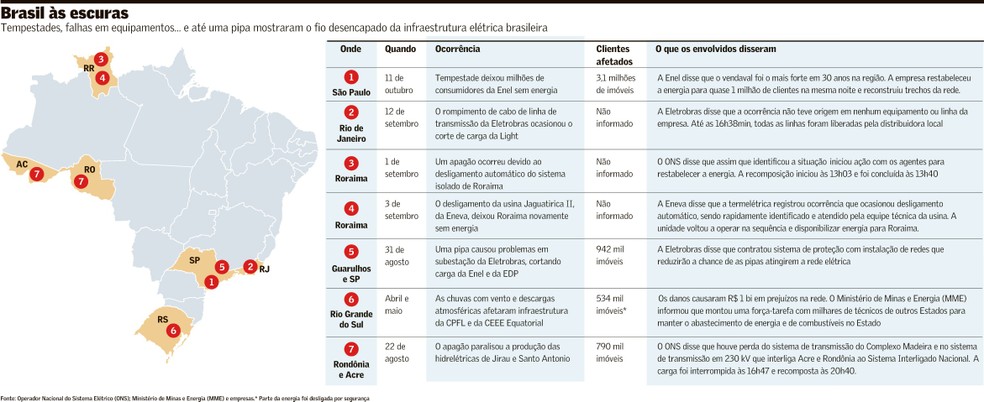 O mais traumático episódio foi o blecaute na região metropolitana de São Paulo, que deixou 3,1 milhões de imóveis sem energia na área de concessão da italiana Enel. A energia foi restabelecida quase seis dias depois.
