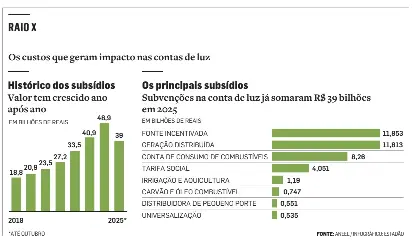 Os dados mais recentes da Agência Nacional de Energia Elétrica (Aneel) mostram que os subsídios para o setor já somaram R$ 39 bilhões em 2025, até outubro, representando 17,58% na tarifa dos consumidores residenciais. No ano passado, chegaram a R$ 48,9 bilhões. E esse montante cresce anualmente. Em 2018, o total era de R$ 18,8 bilhões. •