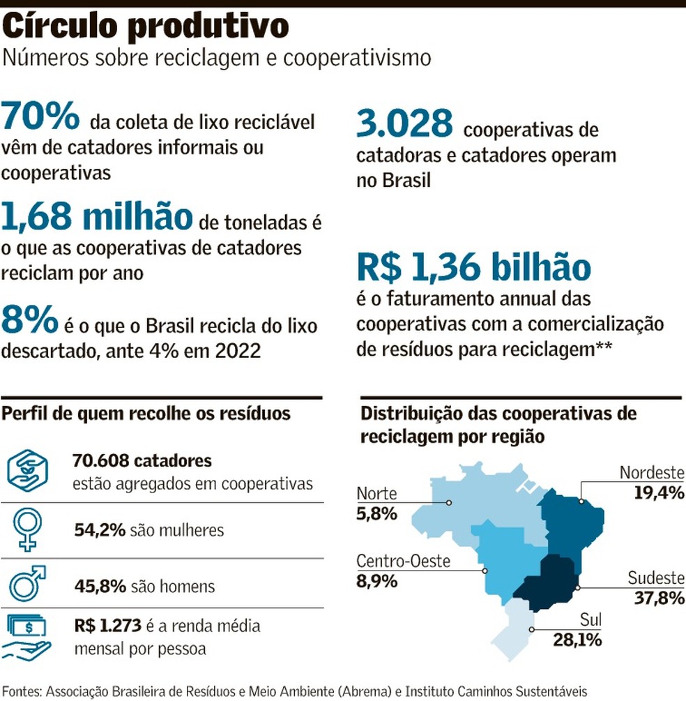 No ano da COP30 no Brasil, a gestão de resíduos sólidos e as cooperativas de reciclagem despontam como protagonistas não somente em questão ambiental, mas também econômica e social. Das 80 milhões de toneladas de lixo produzidos no país, apenas 8% foram recicladas em 2023, e 70% da coleta desse material é proveniente dessas entidades, segundo a Associação Brasileira de Resíduos e Meio Ambiente (Abrema) a partir de dados do SNIS (Sistema Nacional de Informações sobre Saneamento) de 2023. Já o Anuário de Reciclagem, compilado pelo Instituto Caminhos Sustentáveis no ano passado, aponta que 3.028 cooperativas que agregam mais de 70 mil catadores reciclam 1,68 milhão de toneladas em 1.772 cidades brasileiras, com faturamento de R$ 1,36 bilhão no comércio desses itens e redução de mais de 1 milhão de toneladas de emissão de CO2 na atmosfera.