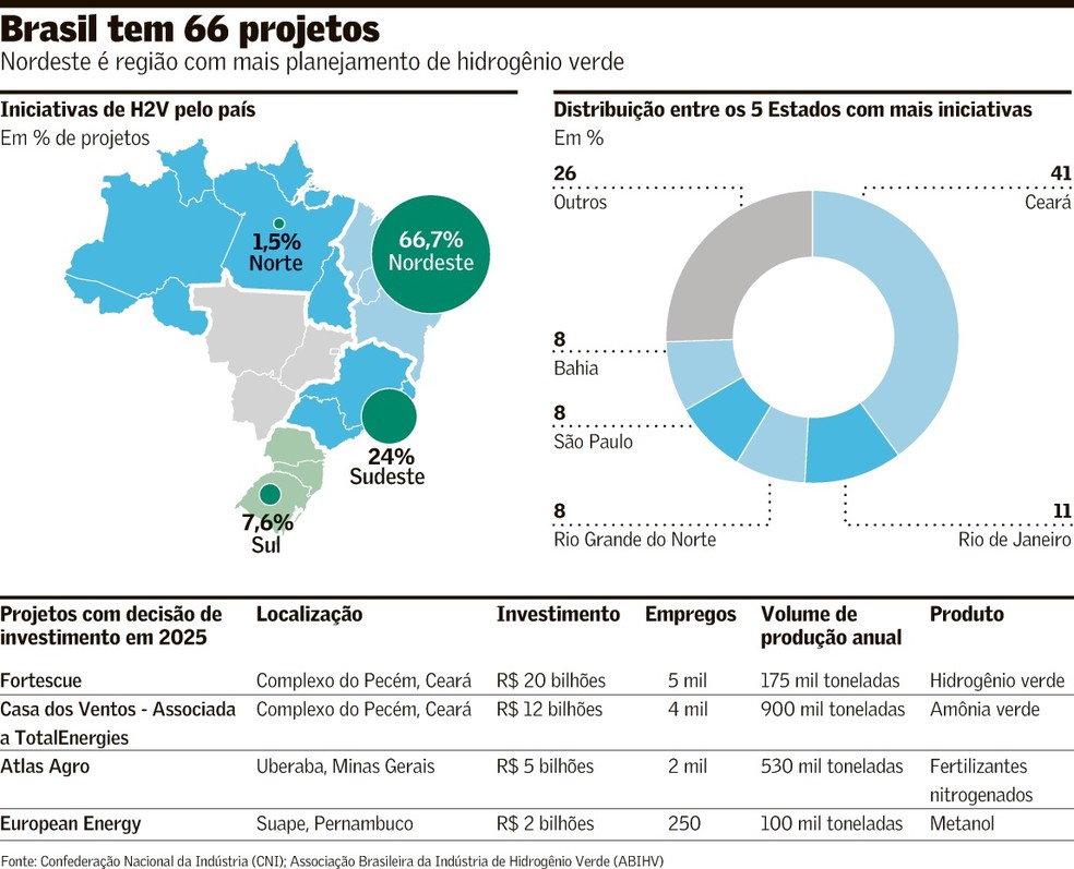 Pelo menos quatro projetos para produção de hidrogênio de baixa ou zero emissão de carbono (hidrogênio verde ou H2V) podem sair do papel a partir de 2025 no Brasil. O Nordeste concentra três desses futuros investimentos, que somam R$ 34 bilhões de um aporte que pode chegar a quase R$ 40 bilhões, se todas as iniciativas no país forem levadas adiante.