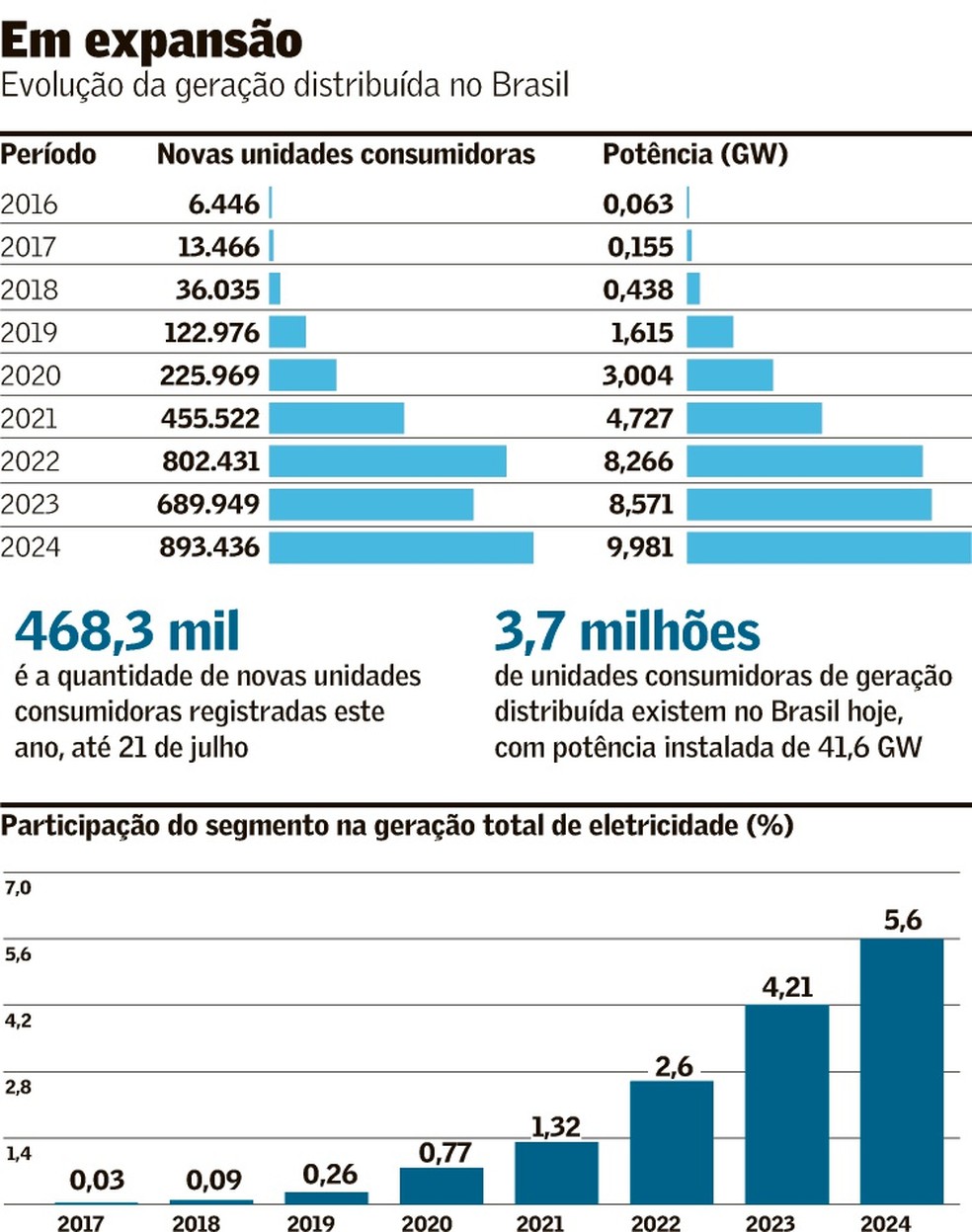 A geração distribuída, modelo em que consumidores produzem a própria energia a partir de fontes renováveis, como a solar, deve crescer 25% este ano, atingindo 43,3 GW de potência instalada e 3,9 milhões de unidades consumidoras. Os números projetados pela Associação Brasileira de Geração Distribuída (ABGD) são expressivos, apesar de juros e carga tributária altos, dificuldade de novas conexões para distribuição e risco de inclusão da modalidade no rateio comercial dos cortes na produção elétrica (“curtailment”), defendida por agentes do setor.