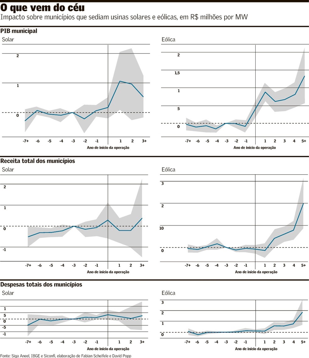 Segundo o trabalho dos economistas Fabian Scheifele e David Popp, esses investimentos causam um salto do Produto Interno Bruto (PIB) desses municípios. Já a criação de postos de trabalho é pequena e temporária, concentrada sobretudo na fase de construção e entrada em operação das usinas. Os efeitos fiscais, por sua vez, dependem do tipo de tecnologia instalada: enquanto municípios que receberam parques fotovoltaicos percebem um impulso mais pontual, aqueles escolhidos para abrigar usinas eólicas veem efeitos mais duradouros na coleta de impostos.