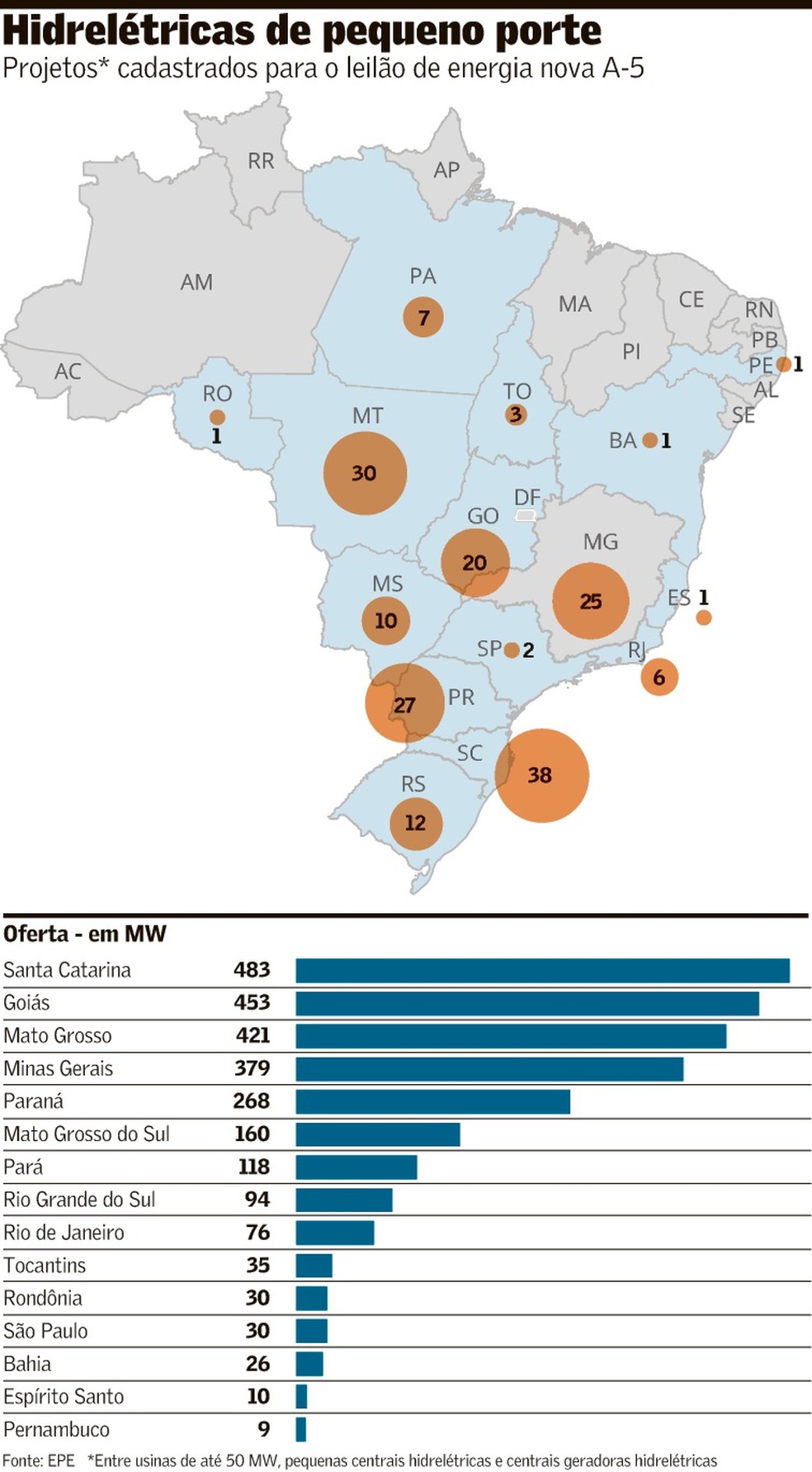 Há 241 projetos cadastrados para o leilão de contratação que irá ocorrer em agosto, número recorde para as categorias, segundo a Empresa de Pesquisa Energética (EPE). Eles estão espalhados por 15 Estados e somam 2.999 MW em capacidade. No A-5 de 2022, por exemplo, foram cadastrados 90 projetos hidrelétricos, com 1.516 MW. “[Os projetos] estavam represados, principalmente pela disputa desigual nos leilões mistos, com solar e eólicas”, diz Pedro Dias, presidente do conselho de administração da Associação Brasileira de PCHs e CGHs (Abrapch).